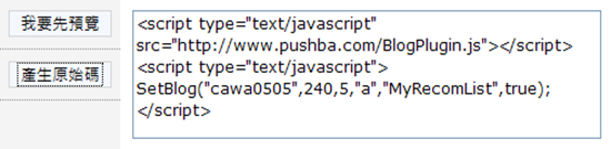 4. 按下「產生原始碼」系統會提供專屬於您使用的部落格外掛元件語法。
